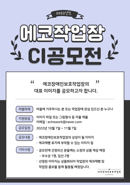 에코장애인보호작업장 CI공모전 진행(~11/7) 페이지 정보 작성자 최고관리자 댓글 0건 조회 176회 작성일 22-10-06 16:47 목록 본문 많은 관심과 홍보 부탁드립니다! 이전글에코장애인보호작업장 CI공모전 결과발표 22.12.08 다음글에코장애인보호작업장 이용인 모집 22.05.25 댓글 0 댓글목록 등록된 댓글이 없습니다.